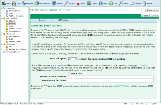 So, the Wait for up to X seconds for an incoming SMTP connection option tells VPOP3 that after dialing up, it should wait at least the specified time before dropping the connection (if there are outgoing messages it might wait longer). If VPOP3 detects an incoming SMTP connection during this time it will stay connected to the dial-up connection until the incoming SMTP connection has ended and then drop the dial-up connection, even if the total online time is less than the time specified in this option.
