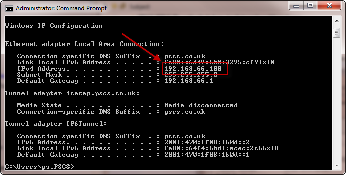 3.In the text that is displayed, you need to look for the line beginning with IPv4 Address and use that value.