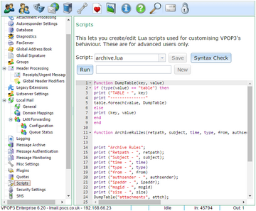 This page lets you create Lua scripts which VPOP3 uses to customise behaviour. These are intended for advanced users who want to customise behaviour beyond what VPOP3 will normally do. We have decided to implement some complex features this way because the vast majority of VPOP3 users will not need those features, so adding settings to achieve them will complicate things for most users.